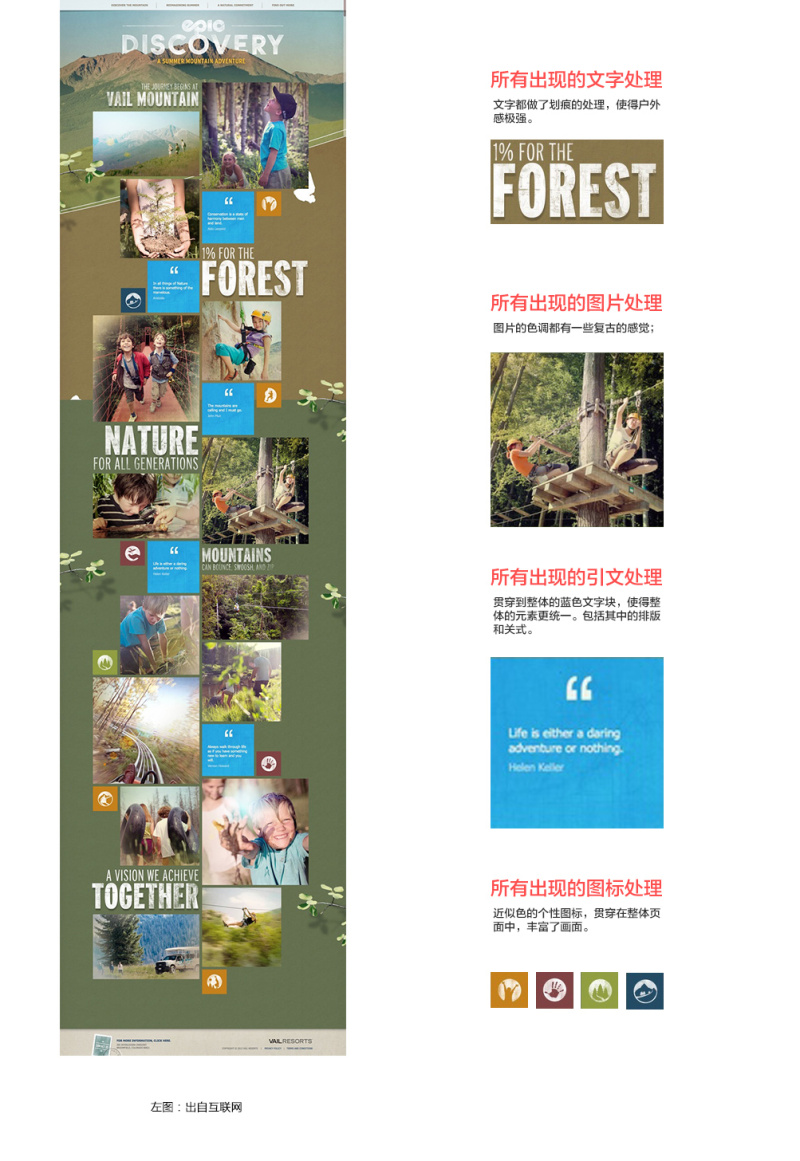 02.右圖是一個(gè)國(guó)外戶(hù)外專(zhuān)題單頁(yè)的設(shè)計(jì),整體以?xún)A斜感的折線(xiàn)為主元素,具有動(dòng)感、運(yùn)動(dòng)的印象。同時(shí),結(jié)合非常有動(dòng)勢(shì)的人物圖片使得整體頁(yè)面的動(dòng)感時(shí)足。