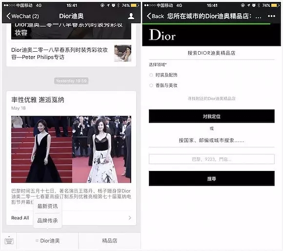現在,如果你點開幾個奢侈品牌的微信公號后,便會發現頁面下方通常都會有兩到三個可選欄目。比如,Dior的公號有介紹品牌故事和最新資訊的子選項,以及通過用戶手機定位功能提供最近門店推薦服務的“精品店”。