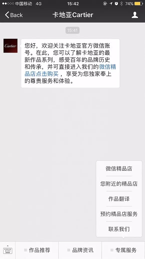 不過,進階版的功能一般多在大眾消費品牌功能出現。因為奢侈品牌的VIP只是極少數購買力極強的顧客。這些品牌本身不存在“會員”這個概念,也沒有所謂的會員禮品,又或是積分制等可以刺激顧客購買欲望和忠誠度的激勵元素。但配合微信點到點、個人化的傳播路徑,奢侈品牌能夠轉而給到更私人化的服務。Cartier公號中的“專屬服務”就是例子。