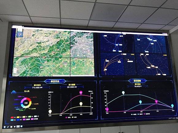 二樓的一個(gè)小房間里,一塊大屏幕上顯示了所有京東無(wú)人機(jī)的飛行狀況,包括定位、時(shí)速、飛行時(shí)間和包裹、訂單的參數(shù)。無(wú)人機(jī)飛行時(shí),兩名運(yùn)營(yíng)人員在大屏幕前進(jìn)行監(jiān)控。