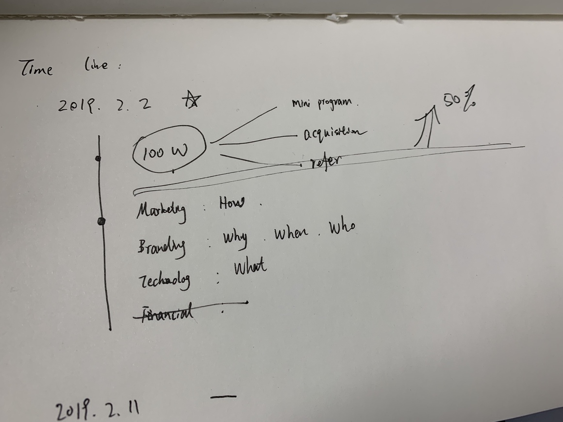 當(dāng)確定好時(shí)間節(jié)點(diǎn),活動(dòng)的策劃成為了側(cè)重點(diǎn)。因?yàn)?019年的農(nóng)歷是己亥年,而且我們也是在春節(jié)期間完成增長(zhǎng)任務(wù),所以這次增長(zhǎng)被定名為“己亥計(jì)劃”。我們先進(jìn)行了一個(gè)梳理,當(dāng)時(shí)的手稿和板書大概有幾十張,比較亂,我的字也比較丑大概長(zhǎng)這樣: