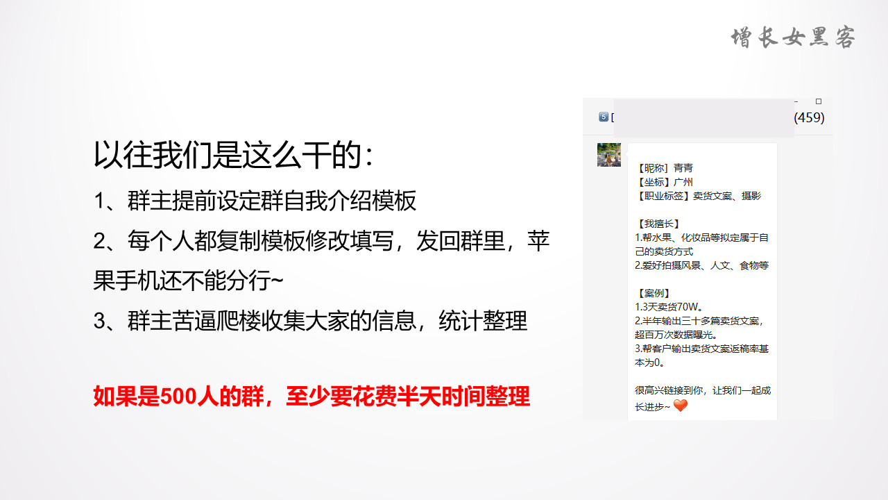 而且我們會發現,如果你社群里用了群勾搭這個小程序做自我介紹的時候,它不需要你經常去做引導大家要做自我介紹。大家發了名片出來之后,每一個發出來的人會引導下一個人去填寫,這是我的一個朋友,在他的學習群里用群勾搭小程序后的效果。他說用了群勾搭小程序之后,發現群內的活躍度要比以往的訓練營要高,不需要人工去引導自己去做自我介紹了,都是用戶自己去做的。