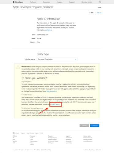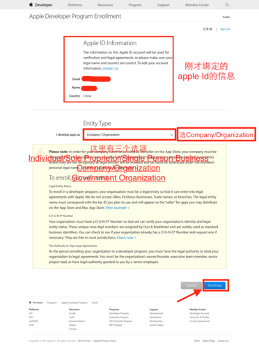4.下面是綁定的apple Id的信息,Entity Type是所要創建的開發者賬號類型,選擇company/organization。直接點擊Continue,如下圖:
