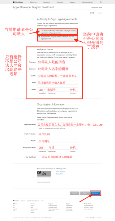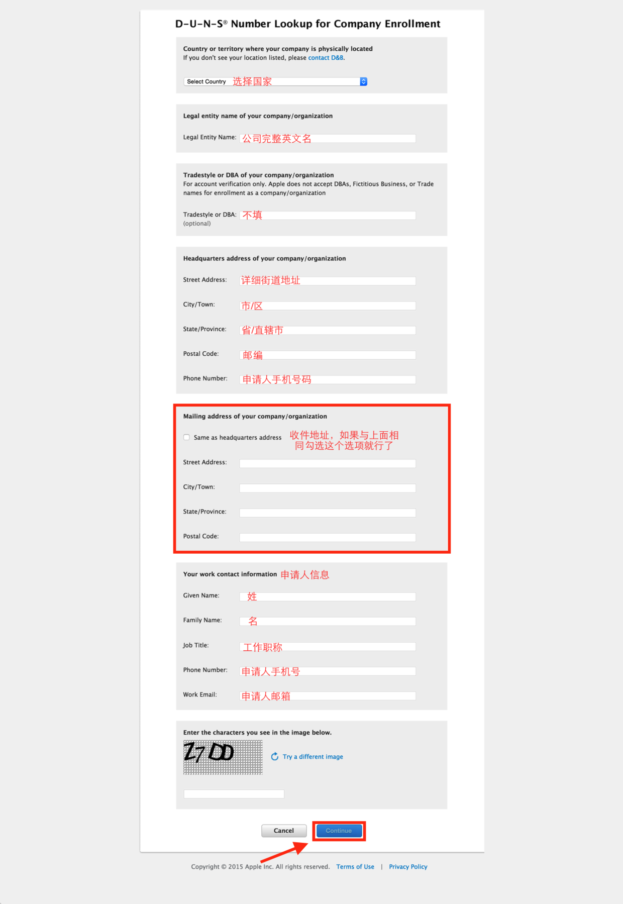 (2)有了鄧白氏碼,你就可以把上面的信息填寫完整,然后可以繼續下一步,這個時候你們公司的基本信息已經提交完整,就等著蘋果給你發郵件就行了。