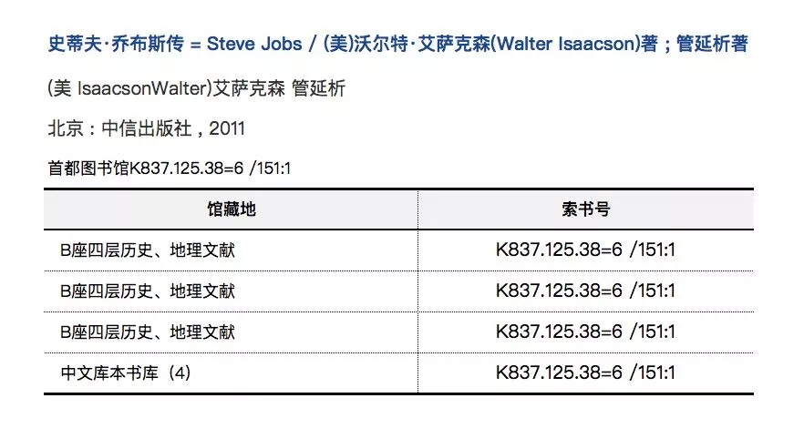 例如,要去首都圖書館借閱《史蒂夫·喬布斯傳》這本書,我們先去檢索系統里查找有沒有這本書,檢索結果告訴我們,這本書存放在B座四層歷史、地理文獻去(K837)。這樣就能很容易找到這本書。