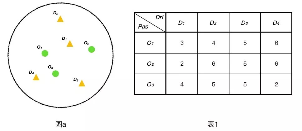 如下圖a,假設在某可派單區域內,同時有O1、O2、O3三名乘客同時開始呼叫,此時在該區域內正好有四名司D1、D2、D3、D3。