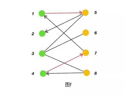 增廣路:從一個未匹配點出發,走交替路,如果途經另一個未匹配點(出發的點不算),則這條交替路稱為增廣路。例如,圖 f 中的一條增廣路:8→4→7→1→5→2。