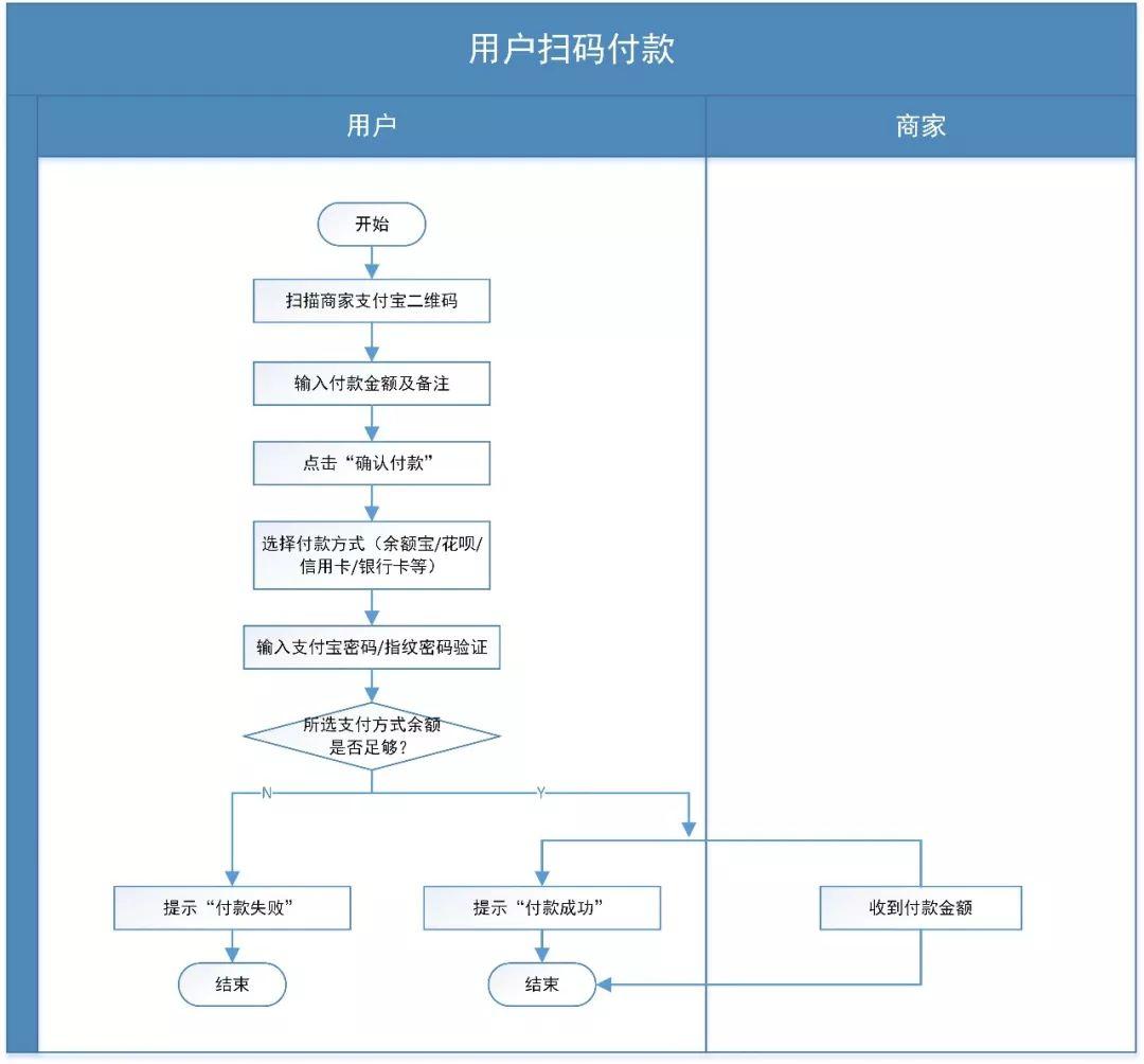 如實(shí)現(xiàn)支付寶掃碼付款功能,涉及的角色有用戶和商家,再畫業(yè)務(wù)流程圖中,可以將用戶和商家分別放于不同的泳道當(dāng)中。